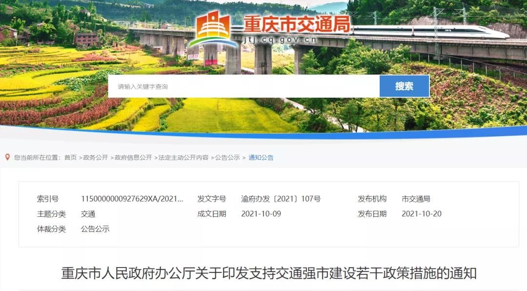 重慶:印發《支持交通強市建設若干政策措施》渝府辦發〔2021〕107號